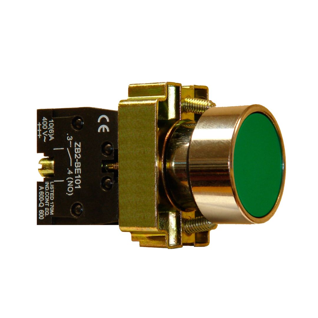 Pulsador aro metálico cromado/botón rasante VERDE. 1Nc.